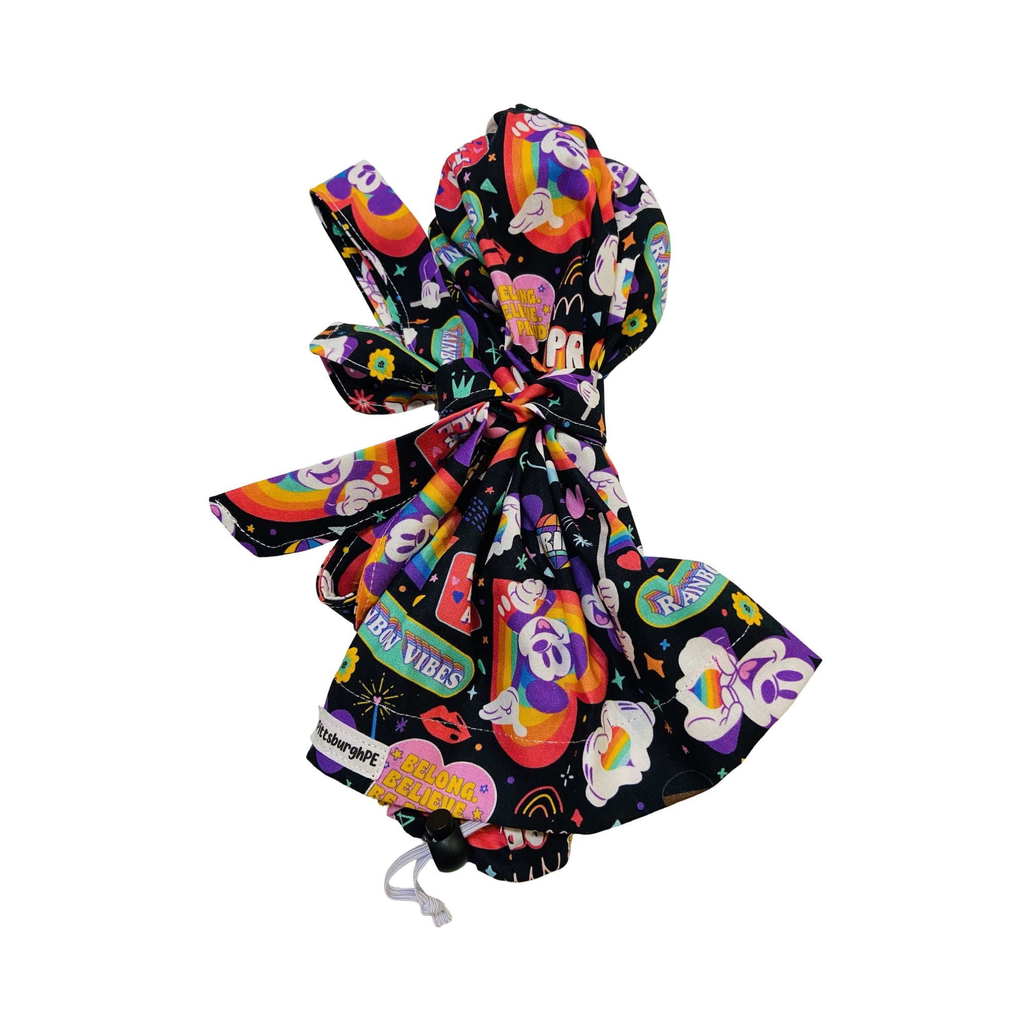 Available in Euro, ponytail, bouffant, high bun and classic tie back. Euro, high bun, ponytail, and bouffant caps have adjustable elastic and toggle. Tie back and ponytail have ties. Fabric tie for bow will be provided with the high bun cap but is not attached to the cap. Black ,or white satin lining is optional.