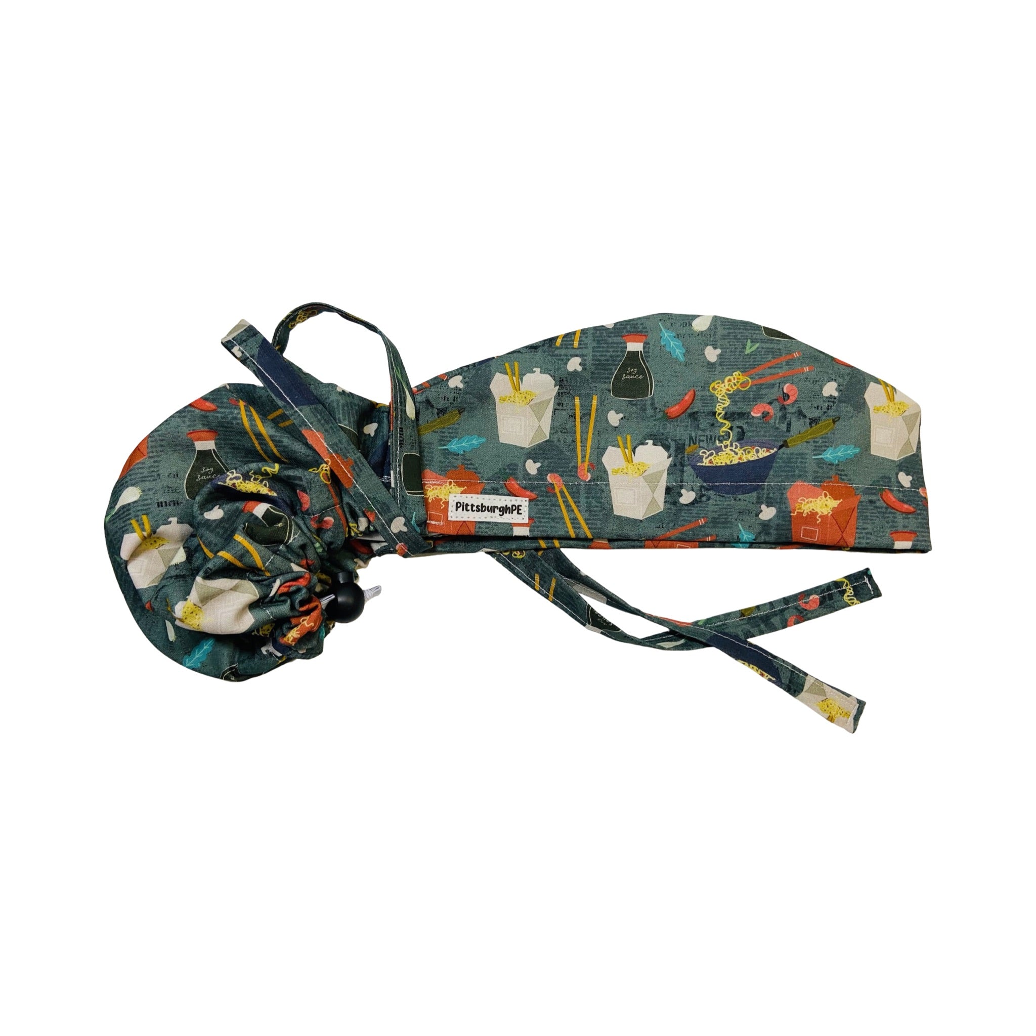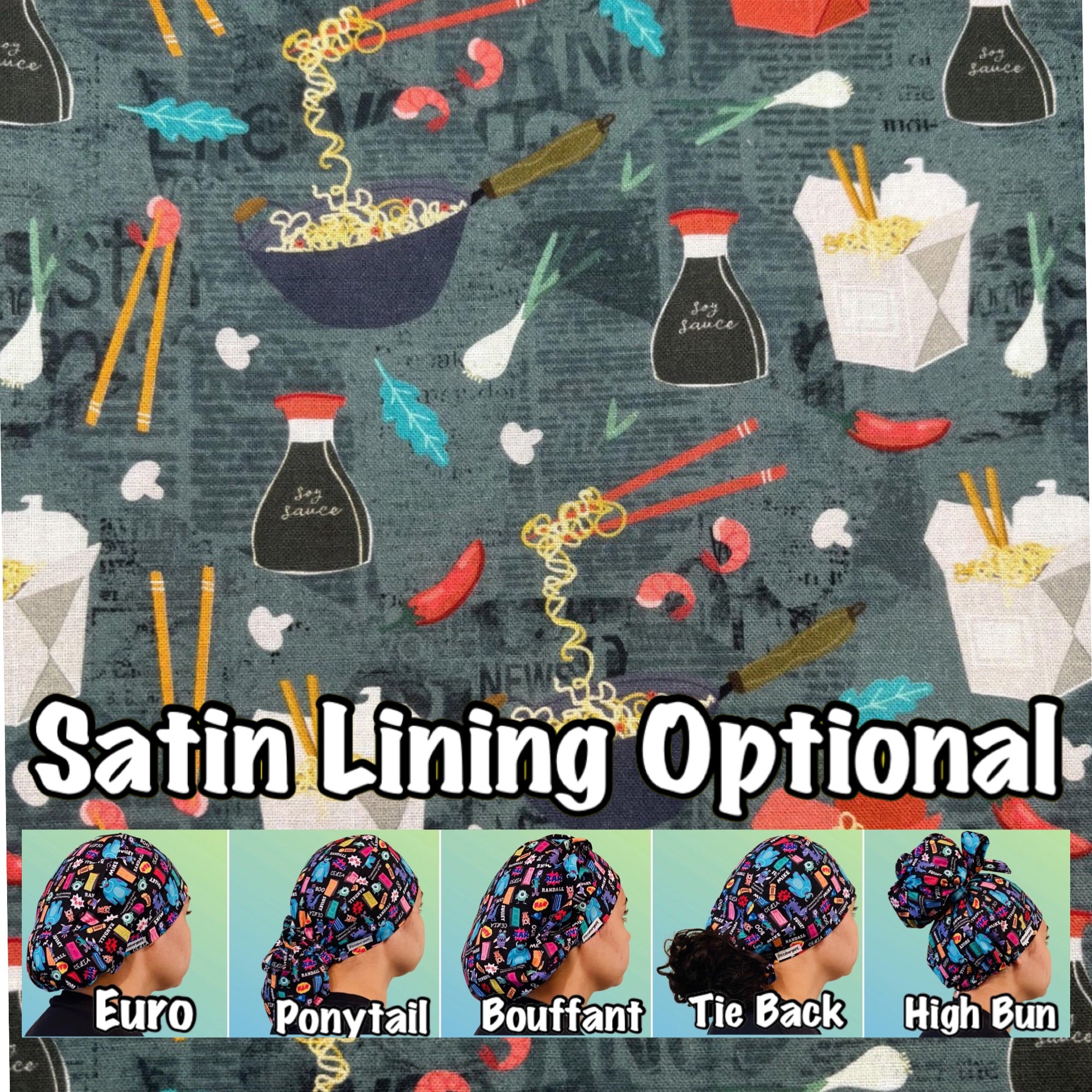 Available in Euro, ponytail, bouffant, high bun and classic tie back.  Euro, high bun, ponytail, and bouffant caps have adjustable elastic and toggle. Tie back and ponytail have ties. Fabric tie for bow will be provided with the high bun cap but is not attached to the cap. Black or white satin lining is optional.