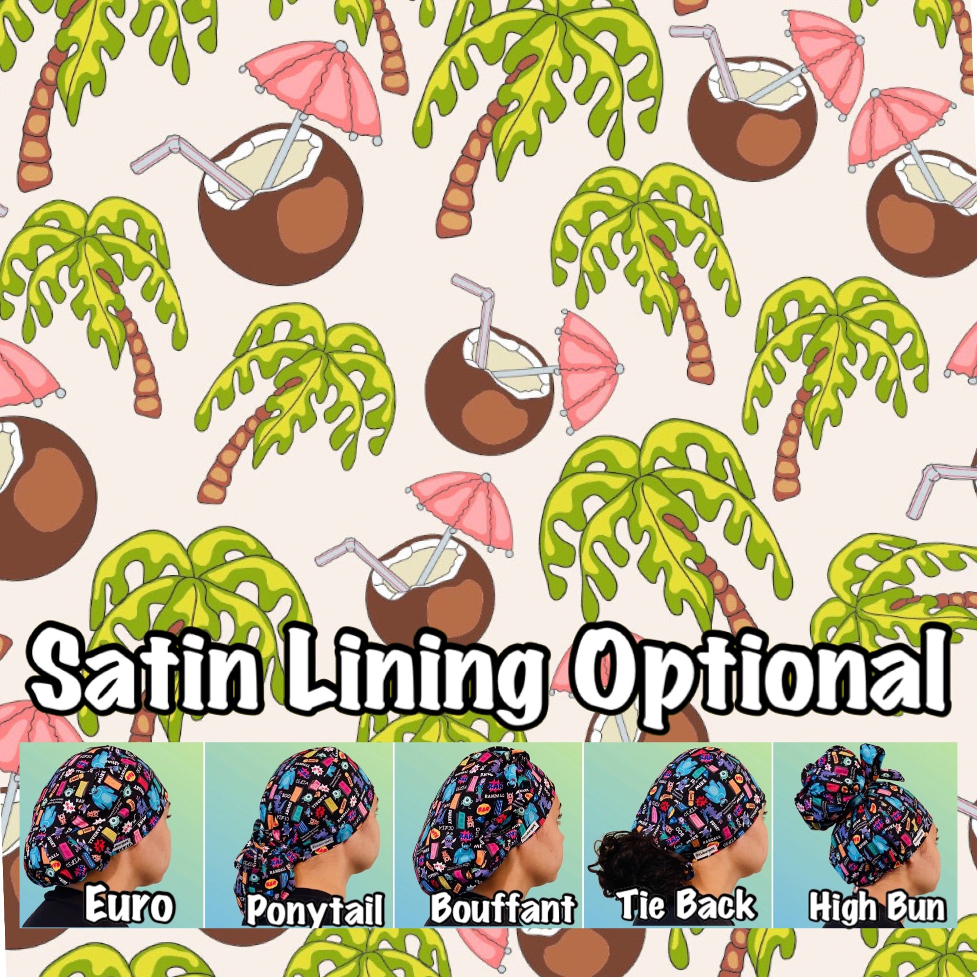 Available in Euro, ponytail, bouffant, high bun and classic tie back. Euro, high bun, ponytail, and bouffant caps have adjustable elastic and toggle. Tie back and ponytail have ties. Fabric tie for bow will be provided with the high bun cap but is not attached to the cap. Black or white satin lining is optional.