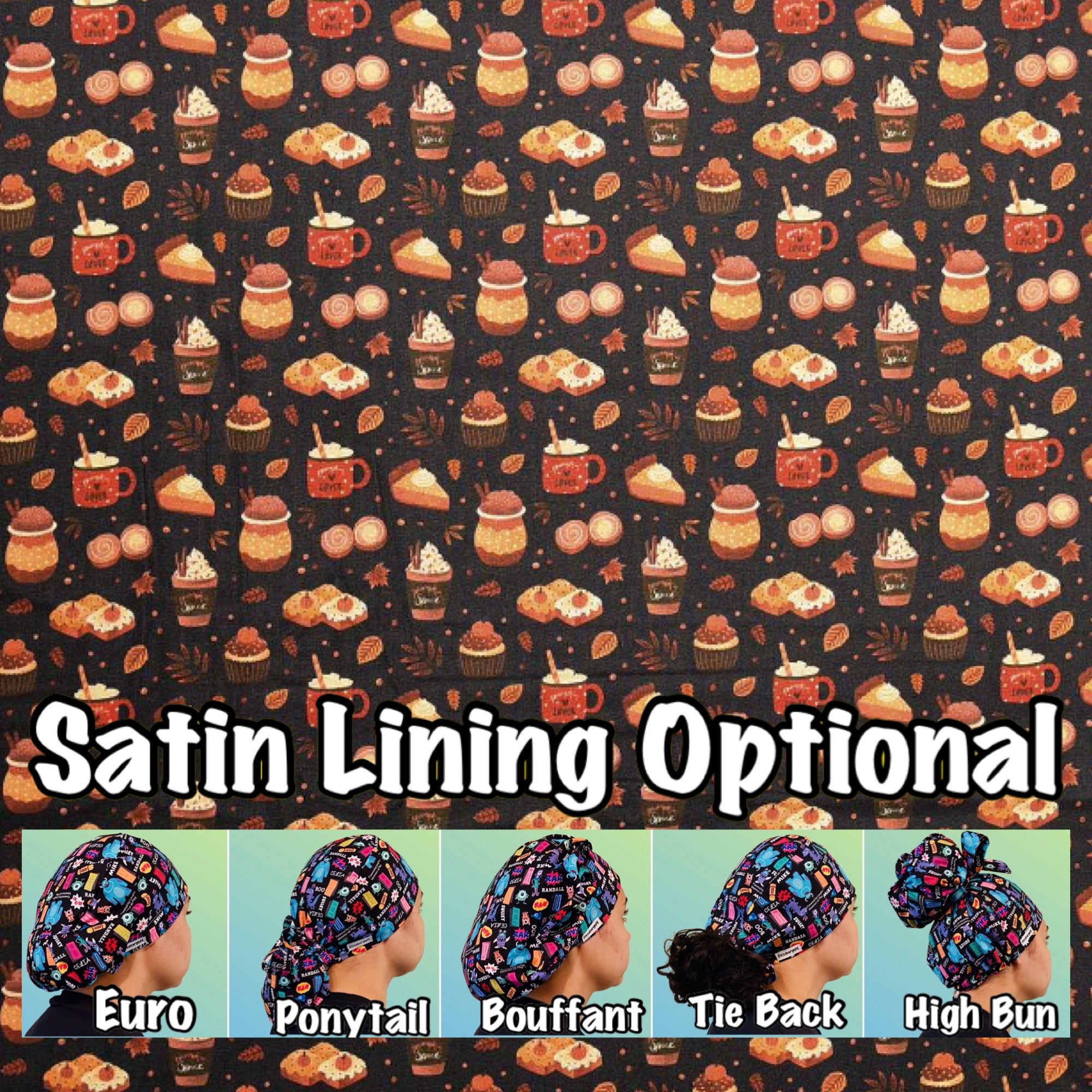 Available in Euro, ponytail, bouffant, high bun and classic tie back. Euro, high bun, ponytail, and bouffant caps have adjustable elastic and toggle. Tie back and ponytail have ties. Fabric tie for bow will be provided with the high bun cap but is not attached to the cap. Black or white satin lining is optional.
