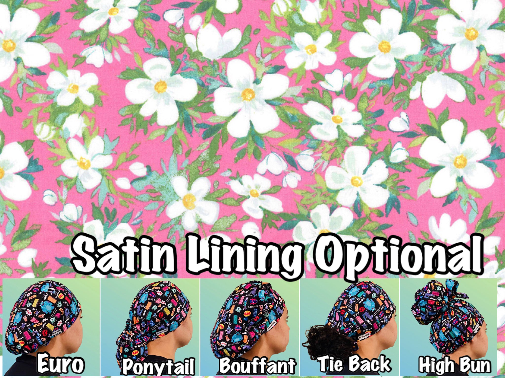 Available in Euro, ponytail, bouffant, high bun and classic tie back. Euro, high bun, ponytail, and bouffant caps have adjustable elastic and toggle. Tie back and ponytail have ties. Fabric tie for bow will be provided with the high bun cap but is not attached to the cap. Black or white satin lining is optional.