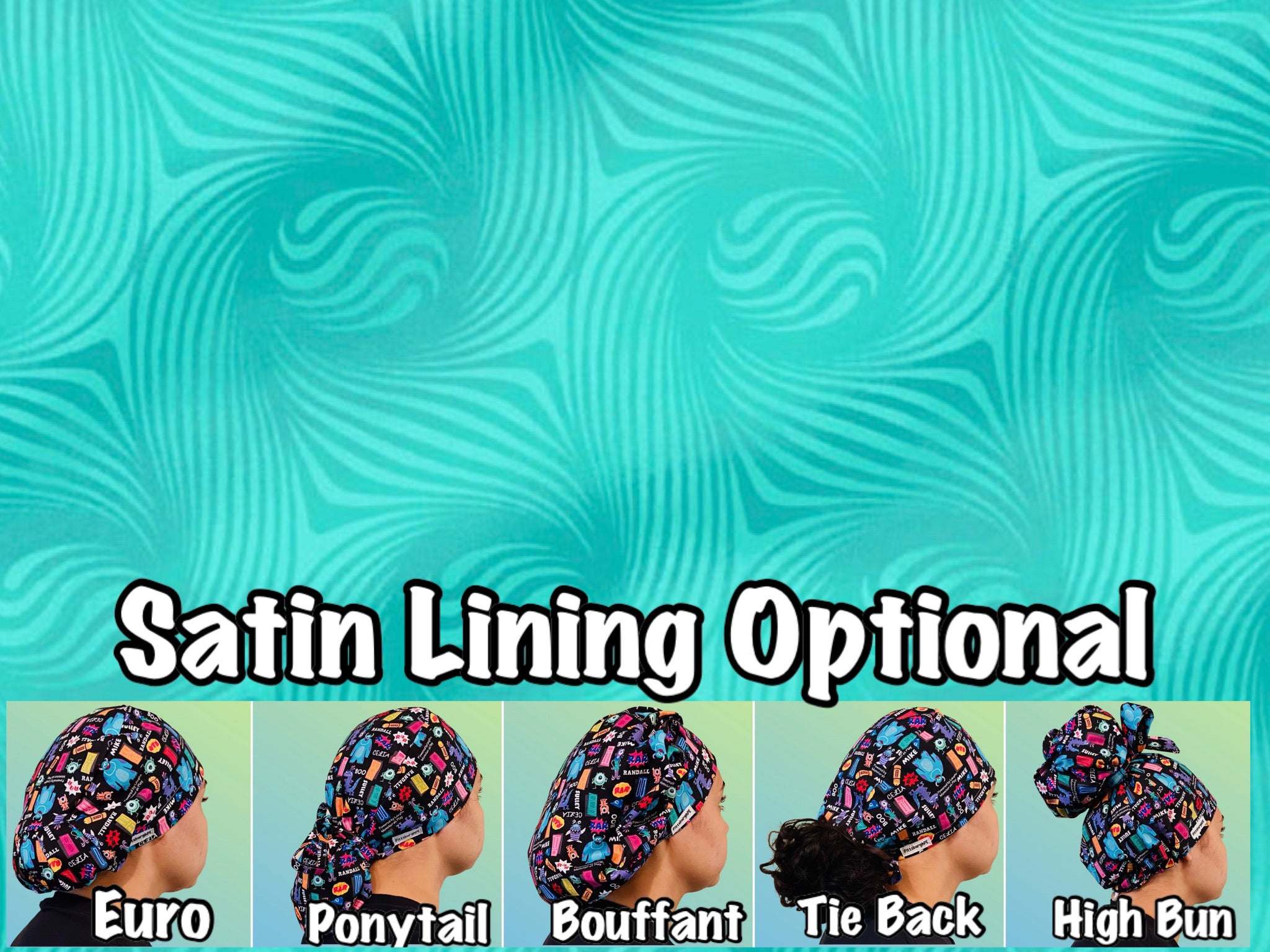 Available in Euro, ponytail, bouffant, high bun and classic tie back. Euro, high bun, ponytail, and bouffant caps have adjustable elastic and toggle. Tie back and ponytail have ties. Fabric tie for bow will be provided with the high bun cap but is not attached to the cap. Black or white satin lining is optional.