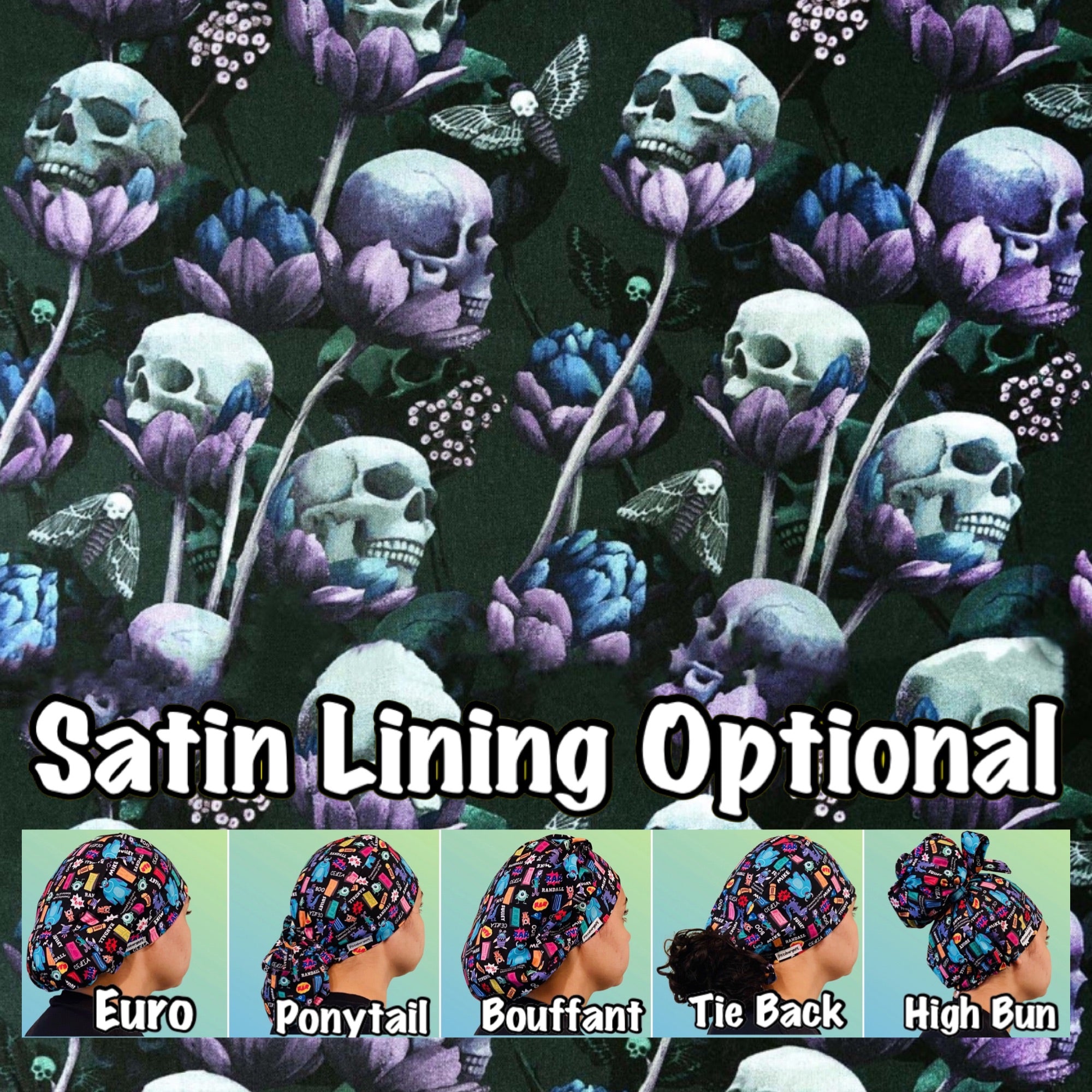Available in Euro, ponytail, bouffant, high bun and classic tie back. Euro, high bun, ponytail, and bouffant caps have adjustable elastic and toggle. Tie back and ponytail have ties. Fabric tie for bow will be provided with the high bun cap but is not attached to the cap. Black or white satin lining is optional.