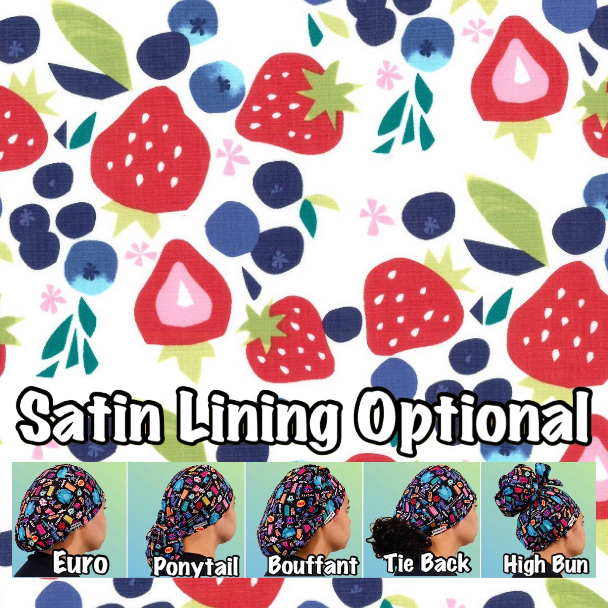 Available in Euro, ponytail, bouffant, high bun and classic tie back. Euro, high bun, ponytail, and bouffant caps have adjustable elastic and toggle. Tie back and ponytail have ties. Fabric tie for bow will be provided with the high bun cap but is not attached to the cap. Black or white satin lining is optional.