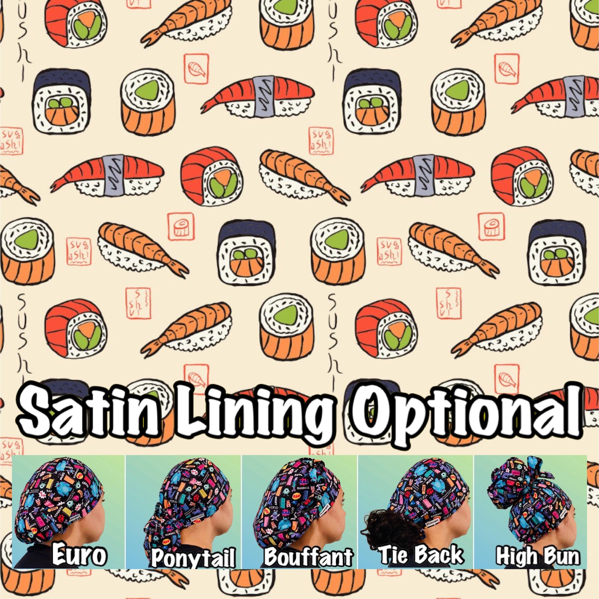 Available in Euro, ponytail, bouffant, high bun and classic tie back. Euro, high bun, ponytail, and bouffant caps have adjustable elastic and toggle. Tie back and ponytail have ties. Fabric tie for bow will be provided with the high bun cap but is not attached to the cap. Black or white satin lining is optional.